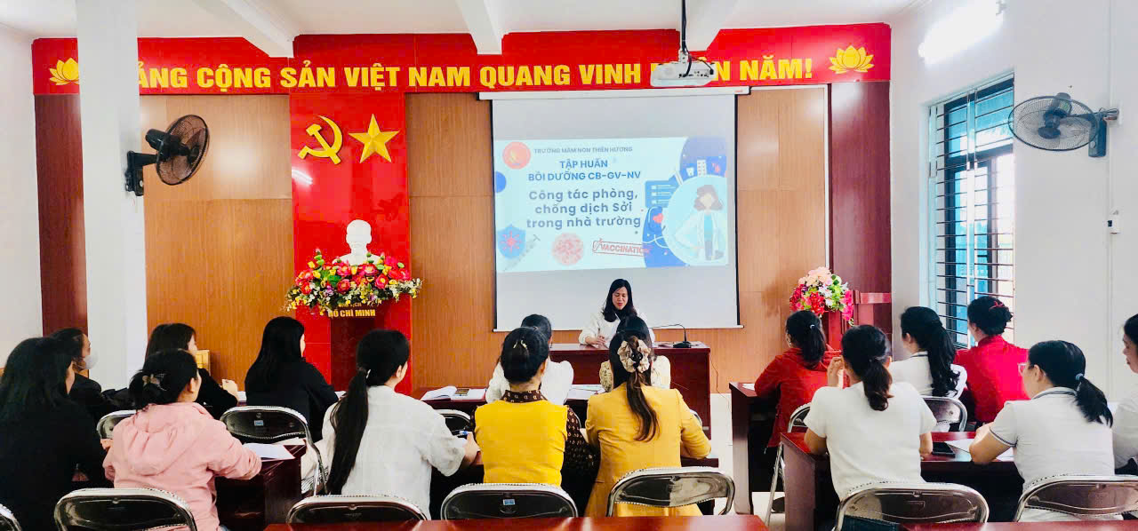 Sáng ngày 26/3/2025 Trường MN Thiên Hương tổ chức Tập huấn cho cán bộ, giáo viên, nhân viên công tác phòng chống dịch Sởi trong nhà trường với tinh thần nghiêm túc, khẩn trương, không để sai sót, chậm trễ trong công tác phòng chống dịch.